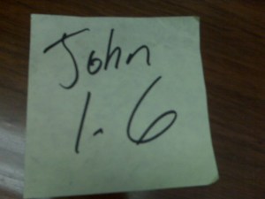 As I was filling up with gas there was a piece of paper containing a work order with a post it note attached. The post it note said, “John 1:6” So I looked up John 1:6 in the Bible. Now before you read it let me inform you that my official first name is John. John 1:6 says, “There was a man sent from God, whose name was John.” What do you think?